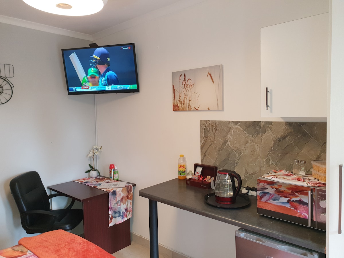 Habitación muy ordenada y limpia con baño propio. En la habitación una cama doble con cafetera y televisión con canales de vista abierta. Podemos desayunar, almorzar y cenar bajo petición y hay vistas abiertas en todas las habitaciones . Contamos con personal de limpieza que puede lavar la ropa por ellos bajo petición. Zona muy bonita con bonitas vistas al Drakensberg. Estamos a 30 minutos del Drakensberg y a una hora del vagabundo de la zona central. Cerca del distrito financiero.