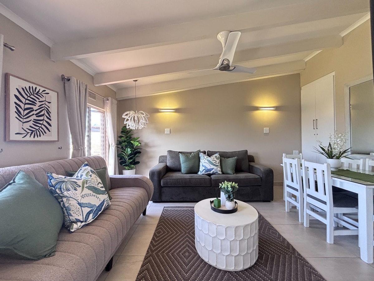 Chalet totalmente independiente de 2 dormitorios y 6 camas Consta de 2 dormitorios cada uno con una cama tamaño king y un baño privado. Salón con sofá cama (solo apto para 2 niños menores de 12 años) TV de pantalla plana en el salón con canales DSTV seleccionados Cocina totalmente equipada. Área de entretenimiento con braai, jacuzzi Ten en cuenta que el área de entretenimiento no es líder en todas las habitaciones. Servicio diario Esta impresionante habitación forma parte de una unidad de villa más grande.