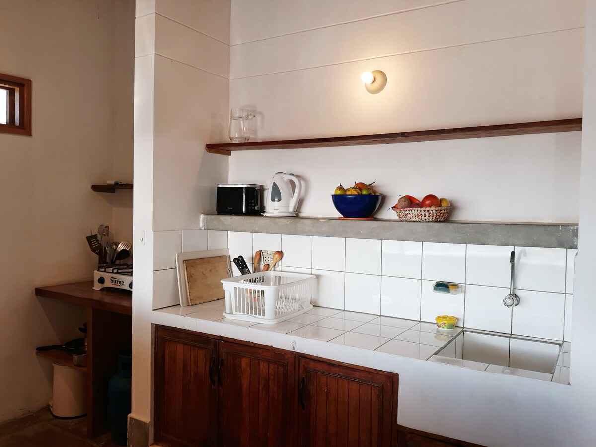 La pequeña casa esta frente al mar en la tranquila playa de Huacura, a 15 minutos en auto al sur de Zorritos. El gran terreno alrededor y frente a la casa esta cubierto de arena y plantado con palmeras. Una amplia terraza totalmente techada con piso de madera, salon y mesa para tomar unos aperitivos, comer y descansar, disfrutando de une linda y relajante vista frente al mar.