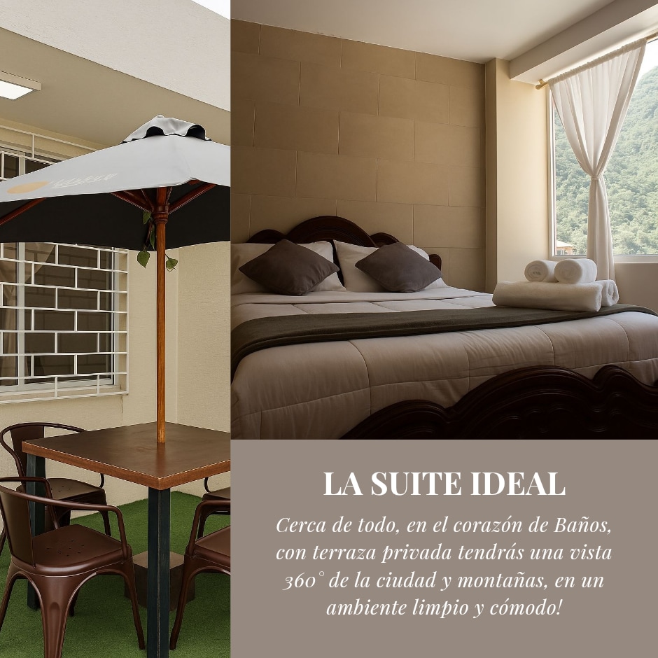 Illari Loft Suite te invita a vivir una experiencia única en Baños. Despierta con una vista espectacular a las montañas y disfruta del amanecer desde la comodidad de un loft moderno, acogedor y lleno de luz natural. Perfecto para parejas que buscan tranquilidad, confort y conexión con la naturaleza, en el centro de la ciudad .