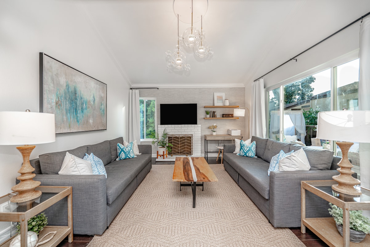 Relájate y desconecta en esta tranquila y elegante casa moderna de mediados de siglo de 1955. Hay mucho espacio para descansar y relajarse, trabajar con wifi rápido y vistas a la piscina, tomar el sol, disfrutar de un libro junto al fuego o cocinar en la cocina gourmet. El café te espera. Ubicación céntrica cerca del aeropuerto SNA, Disneyland, Irvine, hospitales, tiendas y playas. Camina hasta Trader Joe's, una cervecería, el casco antiguo de Tustin, iglesias, templos y mucho más. Rutas de senderismo y ciclismo (carretera y montaña) cercanas. Ven a crear recuerdos bajo el sol.