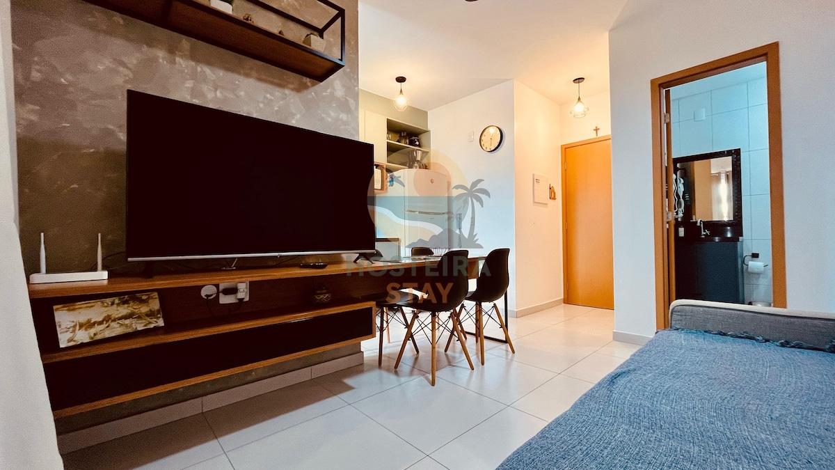 Ubicado en la cuarta planta, el Estudio 410 combina elegancia y comodidad en cada detalle. Su exclusiva decoración crea un ambiente acogedor, mientras que la zona gourmet con barbacoa y hamaca ofrece el escenario perfecto para momentos de relax después de la playa. La cocina completa, la televisión inteligente de 55", el aire acondicionado y la cama tamaño queen garantizan una estancia cómoda. En el condominio, disfruta de la piscina del quinto piso, una gran terraza panorámica y aparcamiento. ATENCIÓN: NO PROPORCIONAMOS SÁBANAS NI TOALLAS