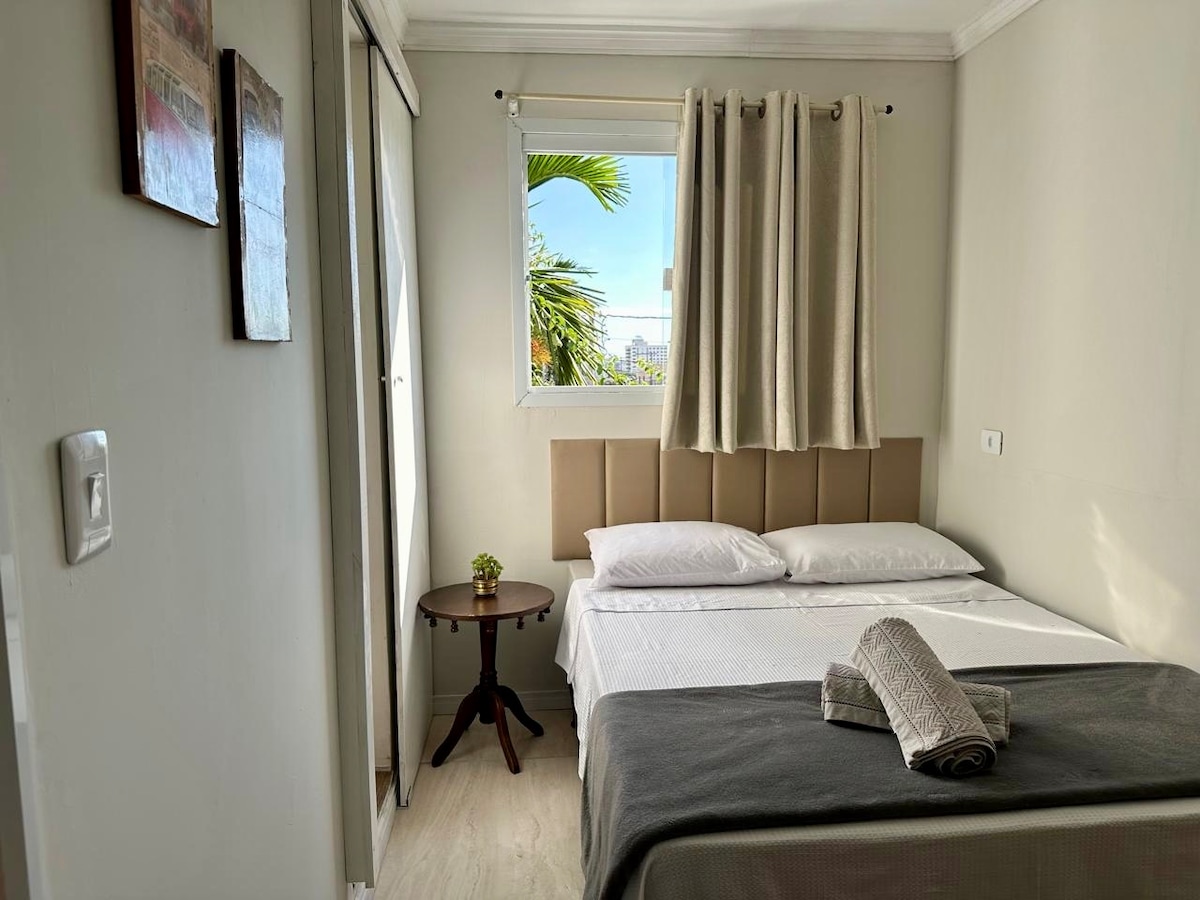 Espacoso , confortável e amplo. Situado no primeiro andar de um edifício de 6 andares no coração de Uberlândia com elevador. Quarto com cama de casal e ar condicionado com armario embutido. Ampla cozinha com todos utensílios Proximo a supermercados e restaurantes. Proximo ao terminal central de onibus urbano. Todo mobiliado inclusive com máquina de lavar . O apto de melhor custo-benefício "do site