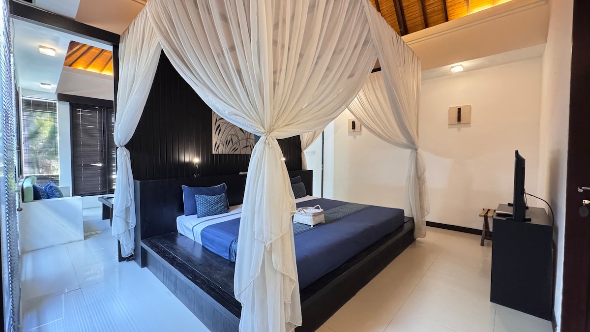 This room is a spacious and luxurious apartment measuring 87 square meters. It features a king-size (wide 240 cm) canopy bed, with an option to request hollywood twin beds. The expansive outdoor bathroom includes a terrazzo bathtub with a view of the sky and a dressing space. The living room, designed in Balinese style with high ceilings, comes with a fully equipped kitchen. In front of the terrace, you'll find public swimming pool. Capacity: 2–3 guests (extra bed available upon request).