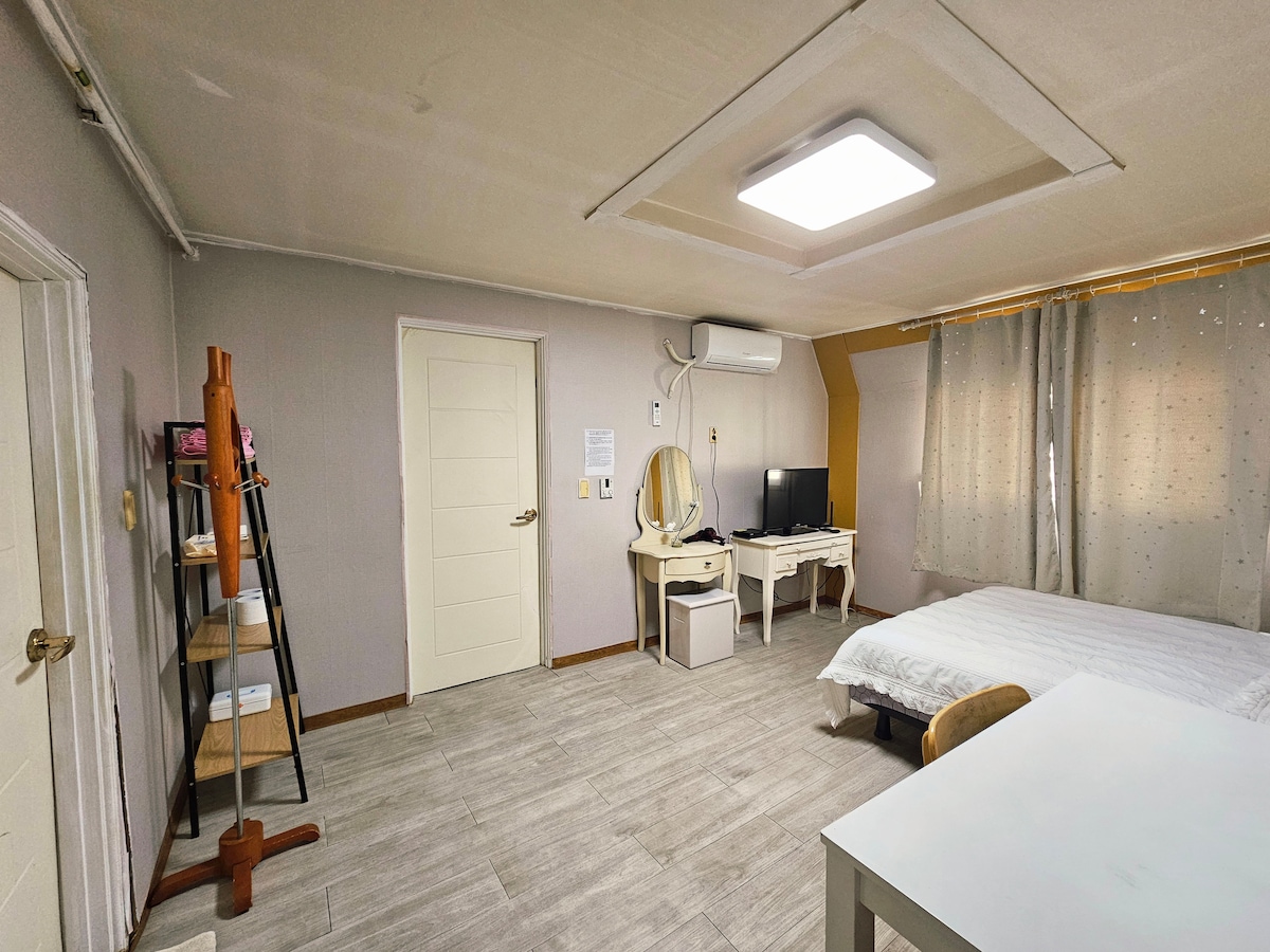 Es en el tercer piso sin ascensor, Es un estudio:) Hay una cocina equipada con utensilios de cocina para que puedas cocinar, Está equipado con lavadora, TV, aire acondicionado, microondas, arrocera eléctrica, etc. Es pequeño, pero te prepararemos todo lo que necesites durante tu estancia :-) • A 10 minutos en coche del aeropuerto de Daegu • 4 paradas de metro desde Dongdaegu Station • Junto a salas de bodas como Queen Bell Hotel, Novia Gala, M Star House, etc. • 3 minutos a pie desde la estación de metro (recomendado para los que vienen en grupos) • Estacionamiento en el edificio (gratis)