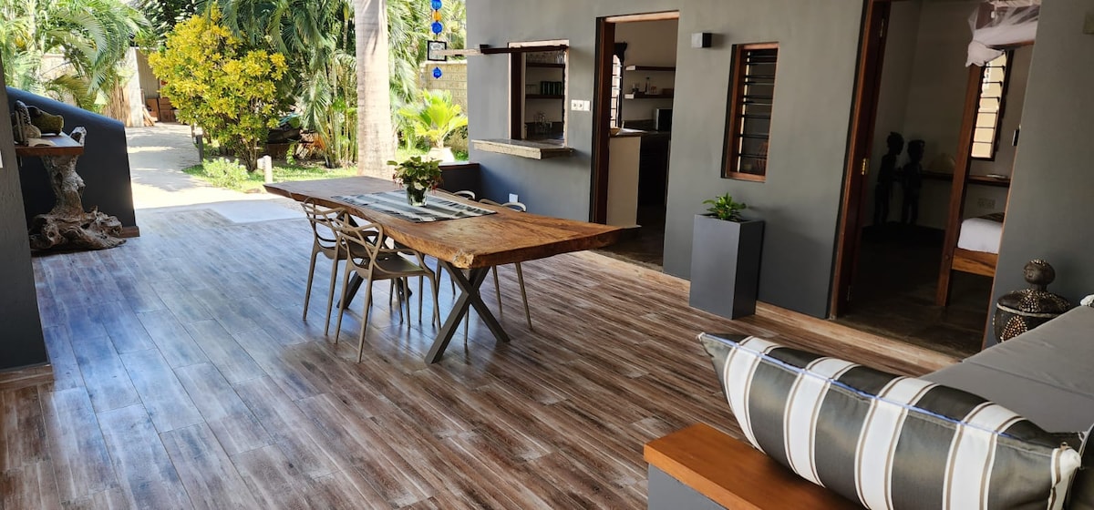 Una casa de 1 dormitorio con una decoración interior sencilla y minimalista en el centro de Diani. Amplia, luminosa y perfecta para estancias cortas o largas. Un cómodo sofá cama grande en la sala de estar, TV inteligente de pantalla plana, wifi rápido y un comedor que se puede utilizar como mesa de estudio/trabajo. Una cocina totalmente equipada, cama tamaño queen en el dormitorio, un baño limpio equipado con toallas y artículos de aseo. Techo alto con ventiladores de techo, ventiladores de pie adicionales, deshumidificador y grandes ventanas de vidrio con persianas para la circulación del aire.