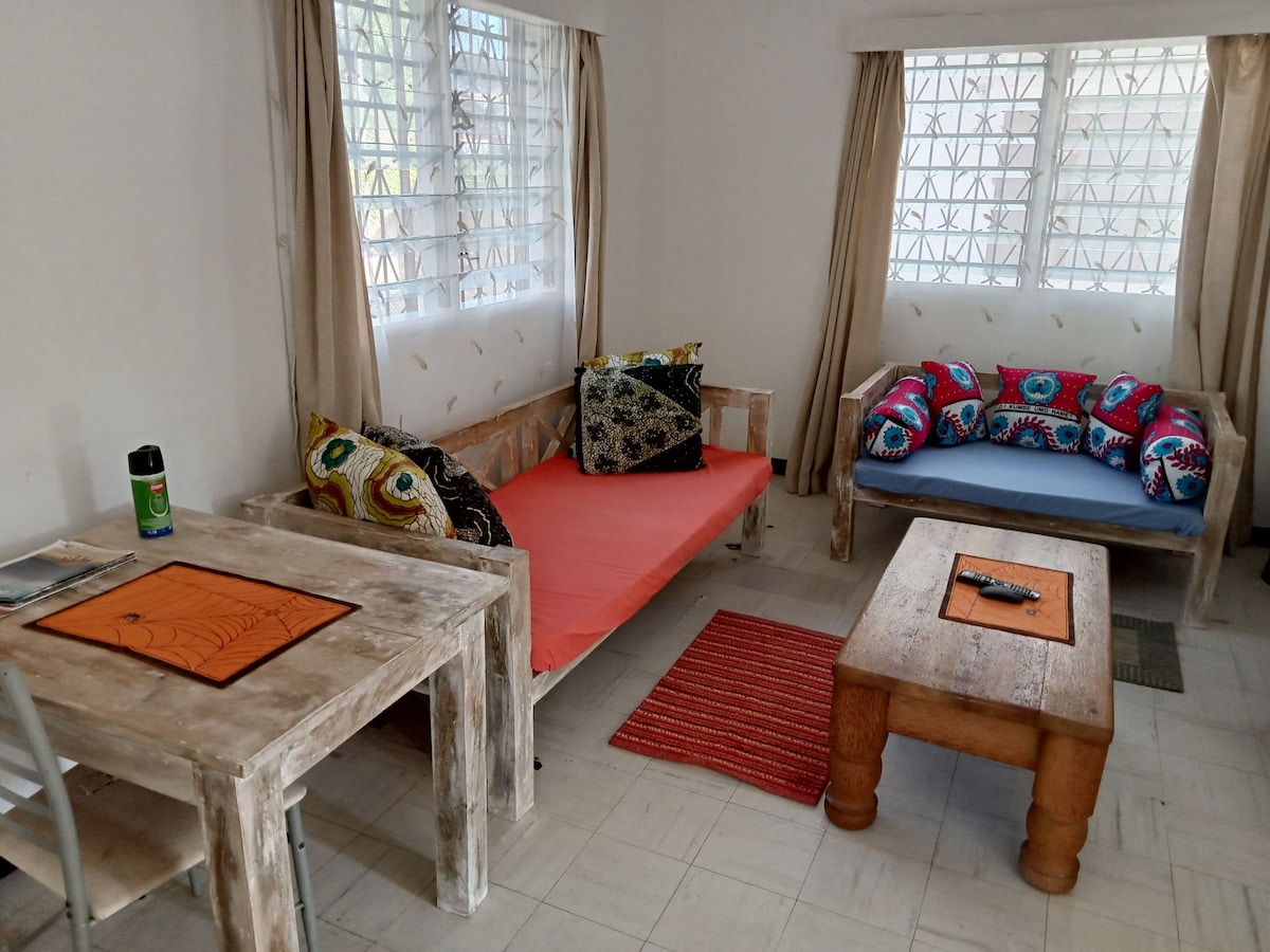 Una casa de 1 dormitorio con una decoración interior sencilla y minimalista en el centro de Diani. Amplia, luminosa y perfecta para estancias cortas o largas. Un cómodo sofá cama grande en la sala de estar, TV inteligente de pantalla plana, wifi rápido y un comedor que se puede utilizar como mesa de estudio/trabajo. Una cocina totalmente equipada, cama tamaño queen en el dormitorio, un baño limpio equipado con toallas y artículos de aseo. Techo alto con ventiladores de techo, ventiladores de pie adicionales, deshumidificador y grandes ventanas de vidrio con persianas para la circulación del aire.