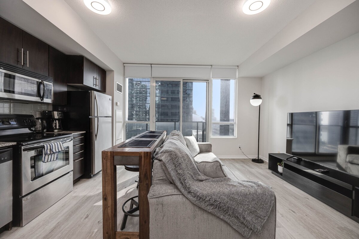 Marvel at the glorious Toronto urban vibes from your room with floor to ceiling panoramic windows. This 1 bedroom condo is professionally designed with modern finishes. You will absolutely love the space we have prepared for you. Relax, unwin,d and enjoy the city views on the private balcony with outdoor furniture. Professionally cleaned after each guest checkout. 100% private and unshared, entire modern condominium unit. Safe, secure, and easy self-check-in procedures with 24/7 security.