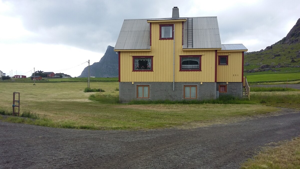 Enjoy your stay in Lofoten in a fishermans cabin with everything you need. The cabin is new, modern, and lays right by the ocean and mountains. The cabin is equipped with everything you need, with a large, fully equipped kitchen, four bedrooms, a living room with a beautiful view, 1,5 bathrooms with shower and washing machine, and a dining room with room for the whole family. Nice fireplace in the livingroom on the second floor.