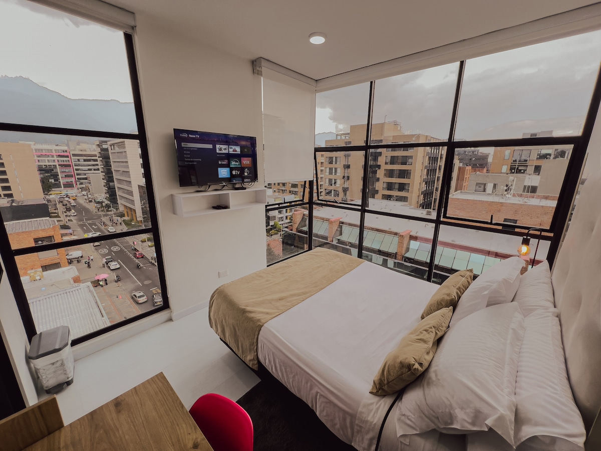 Located in the best area of Bogotá. ideal for business trips, leisure and small families that want to stay in a studio apartment. You will be in walking distance from three main shopping centers, top restaurants, gyms, supermarkets, bars, clubs, parks, coffe shops, hospitals and public trasnport stations in the city. This brand new studio apartament offers 24/7 doorman security a panoramic terrace on the building´s top floor, jacuzzi and front view to one of Bogota´s principal parks, el Virrey