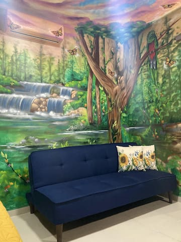 - Porqué mi alojamiento es único: 180° murals inside our studio and garden