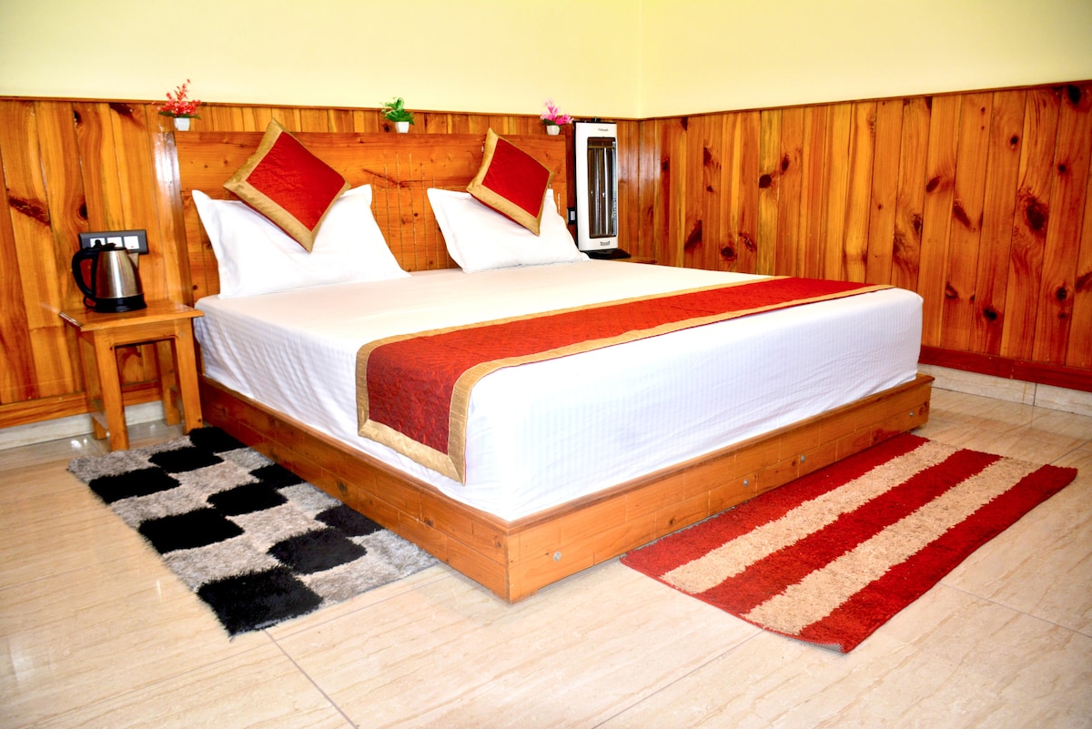 Disfruta del lujo y el encanto en el corazón del Himalaya con nuestra suite dúplex en el ático, diseñada para quienes desean estar cerca de la naturaleza sin renunciar a la comodidad. Una amplia habitación de estilo dúplex con interiores acogedores, perfecta para familias o amigos. El ático de madera aporta un ambiente cálido y rústico, con unas vistas impresionantes de los picos nevados y el río Baspa. Ropa de cama de primera calidad, baño adjunto, espacio para sentarse y grandes ventanales que inundan la habitación de luz natural.