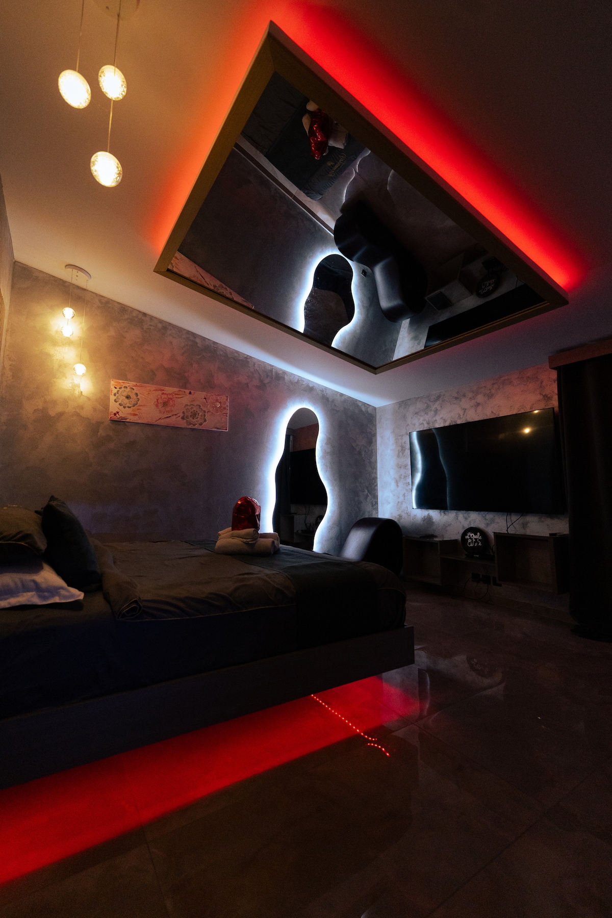 Descubra nuestra habitación de lujo con cama king size, pantalla plana, ducha sensorial, jacuzzi privado y baño turco. Aproveche también su terraza privada para momentos de relajación al aire libre. Situada en una zona tranquila y prestigiosa, nuestra propiedad le ofrece el máximo confort y equipamientos de bienestar. ¡Reserve hoy para una experiencia inolvidable!
