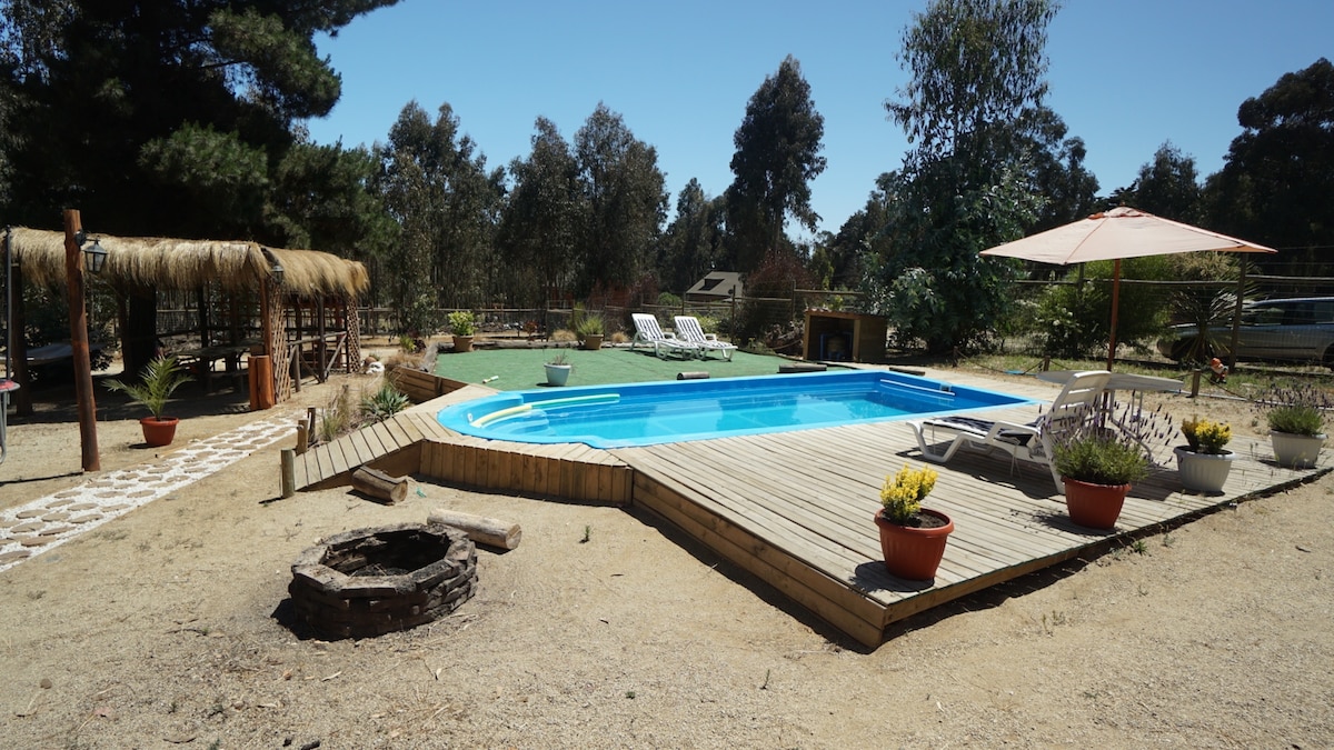 Hermosa cabaña familiar, disfruta campo y mar, interactúa con animales en una visita guiada y disfruta de una experiencia única, a 20 minutos de la playa y con un refugio móvil que te puede llevar en 5 minutos gratis. La cabaña cuenta con 1 dormitorio matrimonial y 2 dormitorios con camarotes cómodos, para 6 personas, cocina, living comedor, zona de quincho y hot tub individual, este último tiene costo extra (valor a pagar con anticipación cada que desee encender), cancha de arena y piscina.