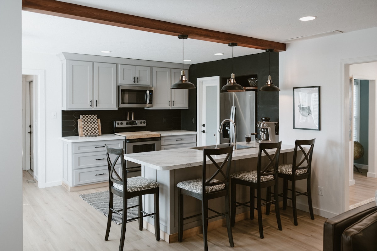 Bienvenido a The Fredstead, una casa de mediados de siglo en el lado norte de Evansville que ha sido completamente y elegantemente remodelada. El Fredstead se encuentra en un barrio seguro y cómodo, cerca de restaurantes, tiendas de comestibles, farmacias, Starbucks y Target. Tanto las camas tamaño king como las queen tienen ropa de cama de lujo para que tengas un sueño relajante. ¡The Fredstead no tiene uno, sino dos baños COMPLETOS! Patios delanteros y traseros, sala de juegos, oficina, cocina totalmente equipada, aparcamiento en la calle, internet de alta velocidad.