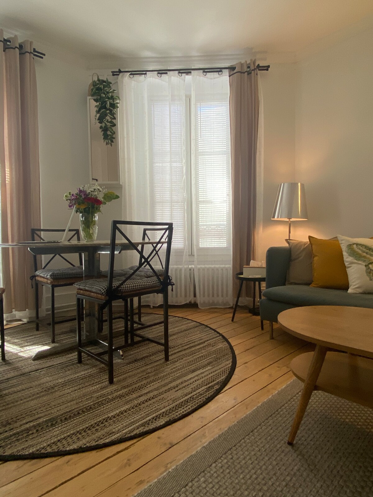 Piso de 43 m2, entorno muy tranquilo (calle peatonal, mucha vegetación). Apartamento luminoso (doble exposición) y bien equipado: salón doble, un dormitorio (con una cama nueva muy cómoda de 2 plazas), posibilidad de una segunda cama (colchón de aire), con cocina separada (y pequeña), baño y aseos. Jardín en el patio interior. Posibilidad de aparcar el coche fácilmente en la calle. Muy cerca (5-10 minutos a pie) de todos los servicios, tiendas y transportes. A 20 minutos del centro de París.