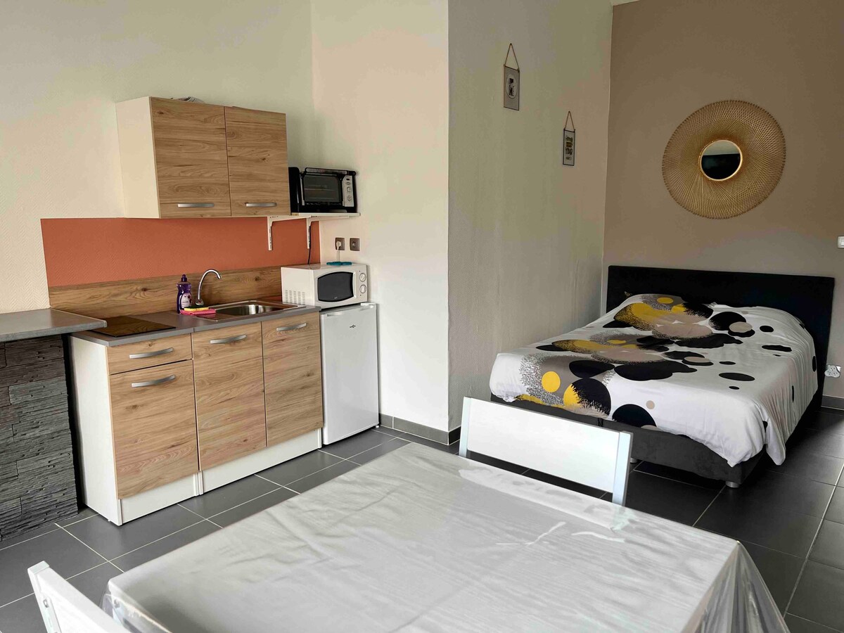 Luminoso apartamento de 35 m2, totalmente equipado, contiguo a la villa, con entrada independiente y plazas de aparcamiento en la puerta. Diseñado y decorado para ser acogedor y cálido. Habitación con colchón de 140 y ropa de cama cuidada, sofá cama en el salón de 140 para recibir a posibles amigos, Terraza de 11 m2, jardín de 80 m2. Relájese en este alojamiento tranquilo donde se acaba de instalar la fibra. Le daré la bienvenida con mucho gusto si anticipa su llegada de 24 horas.
