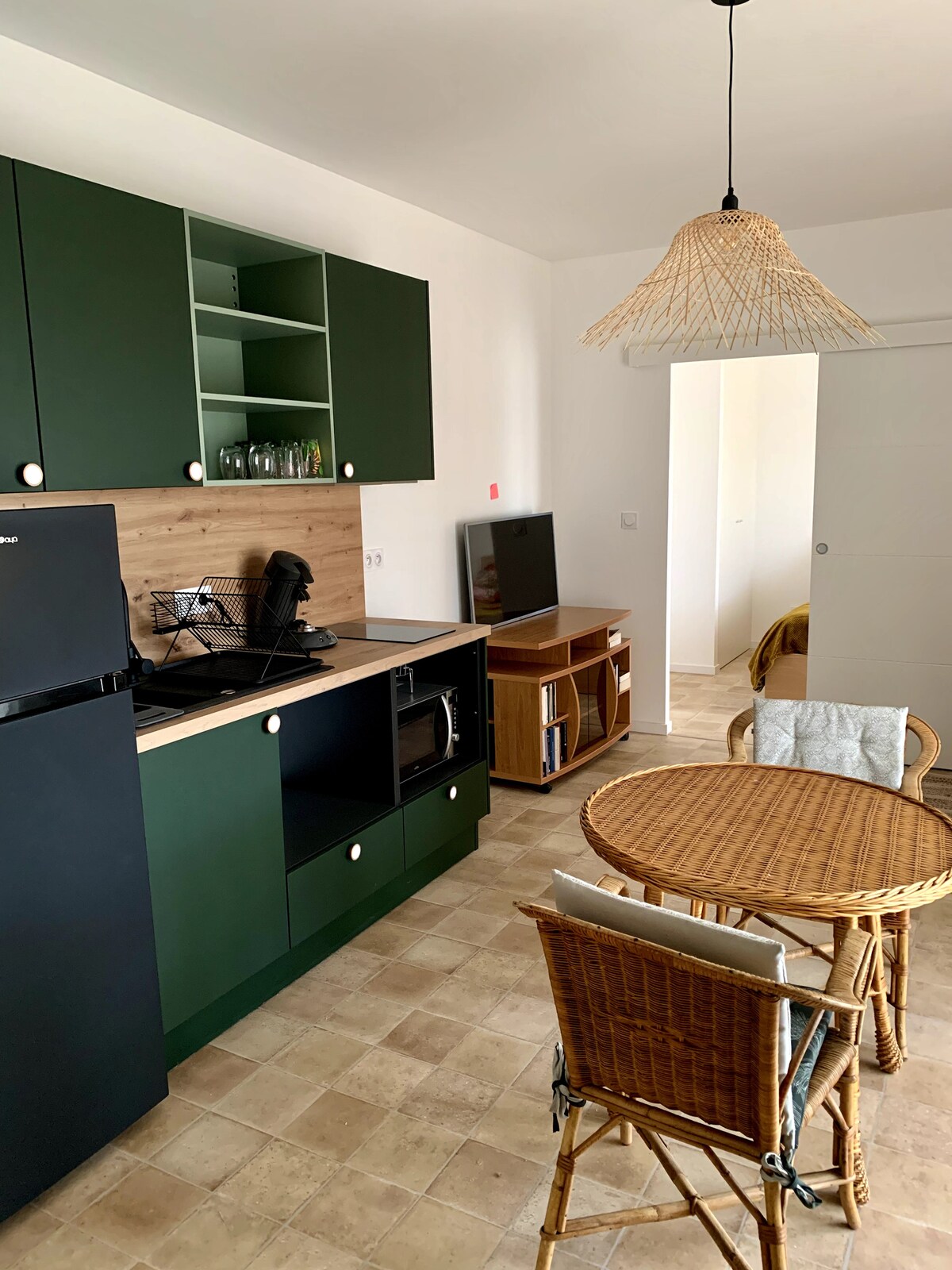 Estudio en el patio de nuestra casa que ofrece una habitación principal con zona de cocina (nevera, microondas, vitrocerámica, hervidor de agua y cafetera nespresso y todos los utensilios de cocina y vajilla), mesa, zona de cama y zona de lectura. Cuarto de baño separado con inodoro. Ropa de cama y toallas Estacionamiento fácil Estudio para no fumadores No se admiten animales Pueblo bien situado entre Nimes y Montpellier Ideal para viajes de negocios de la autopista a9 muy cerca