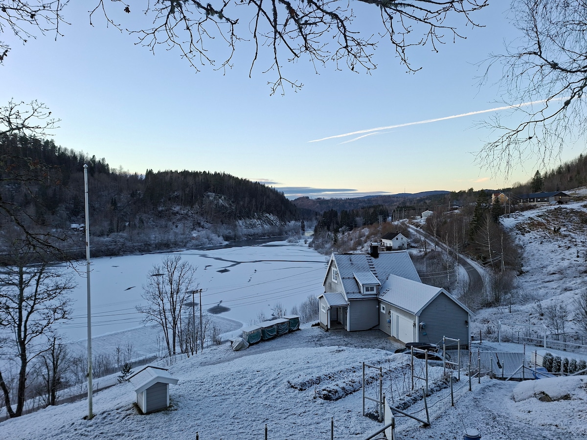 Amplia casa unifamiliar con gran jardín cerca del lago. ¡Grandes terrazas con muy buenas condiciones de sol y vistas al mar desde todas las habitaciones! Chimenea. Playa de arena grande y apta para niños a 100 metros. A poca distancia de bonitas zonas de senderismo en el bosque. El "pueblo más septentrional del sur de Noruega" Svelvik está a un par de minutos en ferry gratuito. Aquí encontrarás tiendas de comestibles, el monopolio del vino y un acogedor pub con buena comida. Completamente equipado con lavavajillas, lavadora y secadora. Cargador de autos eléctricos y banda ancha de fibra. Capacidad para 6 adultos y 2 niños.