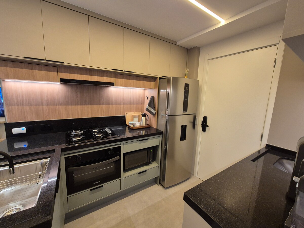 Apartamento nuevo en un condominio de alto nivel, junto al Expocenter Transamerica (200 m) y Beyond Club (100 m). La propiedad tiene 2 dormitorios: una suite con una cama tamaño queen y otra con una cama nido, con capacidad para 4 personas. Fácil acceso a Marginal Pinheiros (Av. das Nações Unidas), cerca del centro comercial Morumbi y Marketplace (4 km) y del Parque da Cidade (3 km). 1 plaza de aparcamiento, wifi, 2 aparatos de aire acondicionado, lavadora, Smart TV en el dormitorio principal (50 pulgadas) y sala de estar (77 pulgadas).