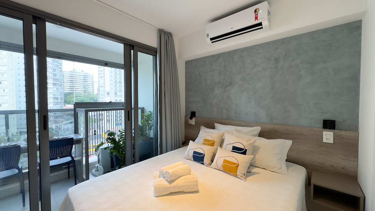 Brand new, fully-equipped studio in the heart of Pinheiros! Close to the best bars and restaurants, 10 mins from Faria Lima and 8 mins from Av. Paulista. • 300m from Oscar Freire • 200m from subway station • 1 block from the supermarket • 5 minutes from the Hospital • Electronic lock (no key needed) • OMO laundry in the building • Gym and co-working space • Bicycle storage • Mini-market with basic products in the building 1 double bed + 1 sofa bed suitable for children or 1 adult