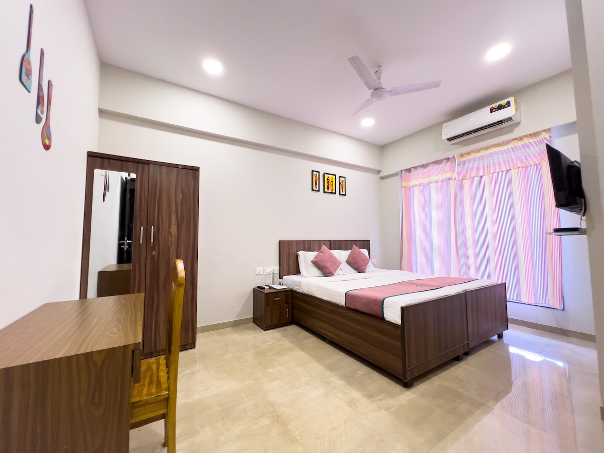Alójate de lujo en nuestro apartamento de 1BHK totalmente amueblado, que ofrece un dormitorio acogedor, dos baños (un dormitorio adjunto, uno común ) y una cocina totalmente funcional con electrodomésticos y utensilios de cocina básicos. Relájate en la amplia sala de estar con un televisor inteligente grande y un elegante diseño interior. Disfruta de muebles de alta gama que crean un hogar lejos de casa. Perfecto tanto para estancias cortas como largas, este apartamento promete comodidad y conveniencia en una ubicación privilegiada en la ciudad. ¡Reserva ahora y disfruta de una estadía excepcional!