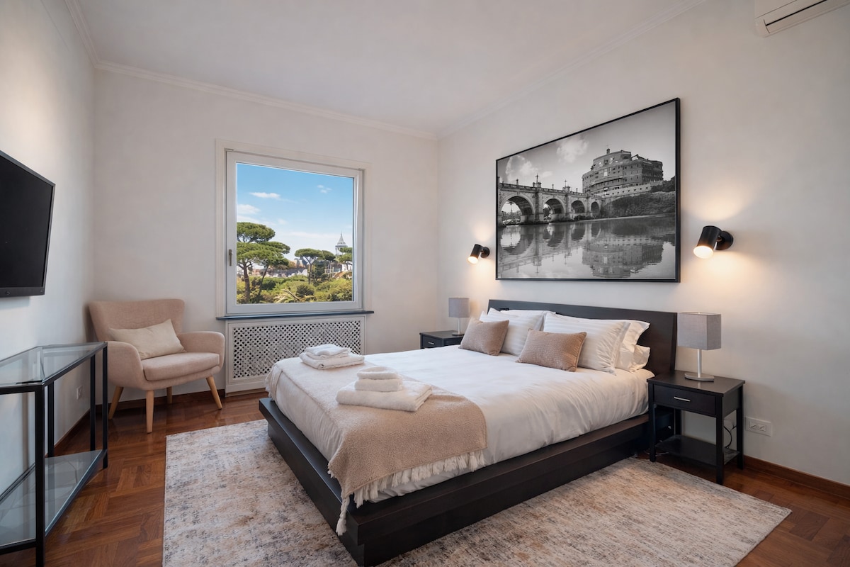 En el centro de Roma, un ático privado con persianas abiertas en una sala de estar para maximizar la luz y revelar vistas panorámicas del centro de Roma y la basílica de San Pedro. Una chimenea de época y baldosas de terracota crean una sensación tradicional. Terraza privada totalmente amueblada. Dos habitaciones con cama doble. A diez minutos a pie de la plaza de San Pedro y los Museos Vaticanos. Con vistas a Roma y San Pedro. A 2 minutos a pie del transporte público, autobús y metro que te llevarán fácilmente a todos los principales sitios históricos.