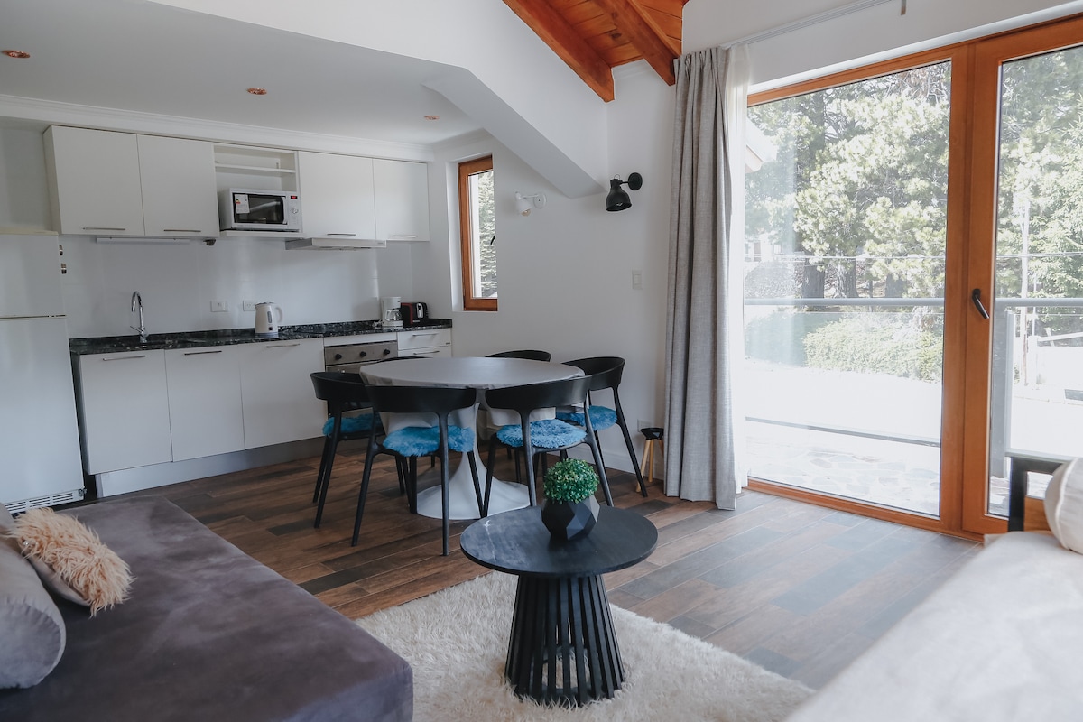 Quédate en este alojamiento único y disfruta de una visita inolvidable. Hermoso monoambiente luminoso equipado para un máximo de 4 personas ubicado en la base del cerro Catedral a 300 mts del cablecarril, frente a las pistas de Condor 1, cuenta con dos somieres simples que se juntan y se arma una cama doble y con un carricama cada uno, cocina y completa, Smart tv 50 " , internet.