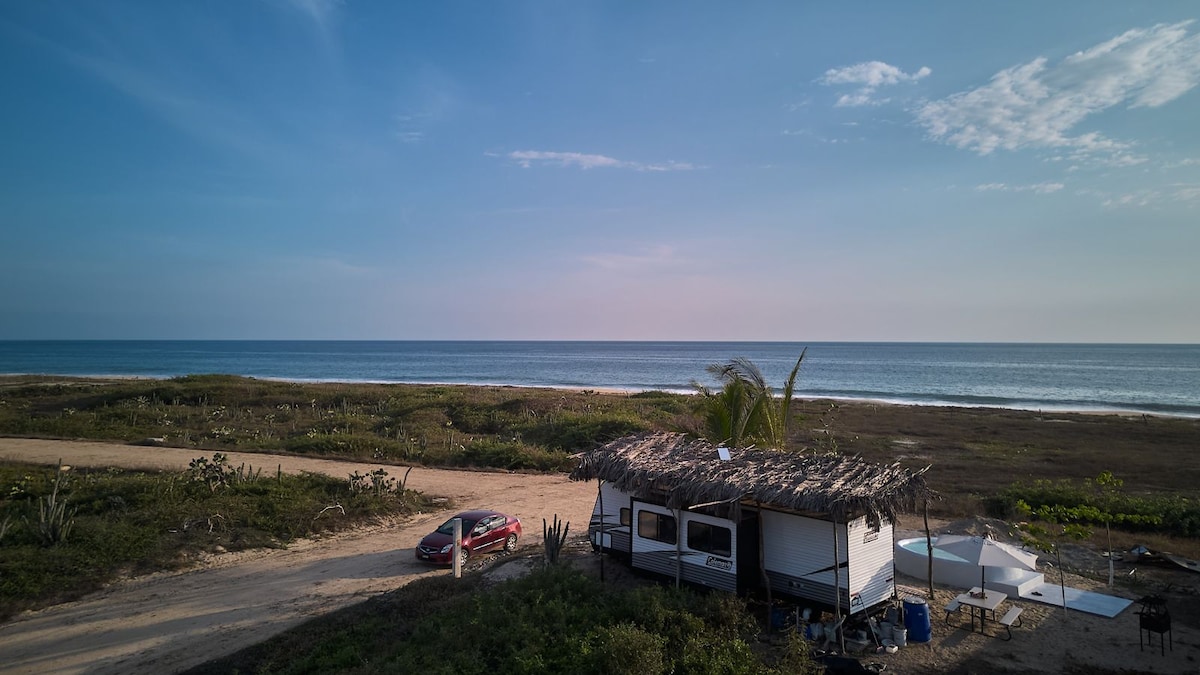 Vive la experiencia de vivir dentro de una casa rodante a sólo 40 metros del mar, rodeado de naturaleza. Adentro encontrarás todas las comodidas, afuera la playa, siempre vacía. Vista a las montañas y cerca de la laguna. Highlights: una hermosa alberca privada, Starlink, parrilla y hamacas. A/C, Tv de 50''. Cocina equipada, refri dentro y fuera de la casa. El fraccionamiento es cerrado, seguro y tranquilo a solo 25 minutos del aeropuerto. ¿Algo más para ser feliz?