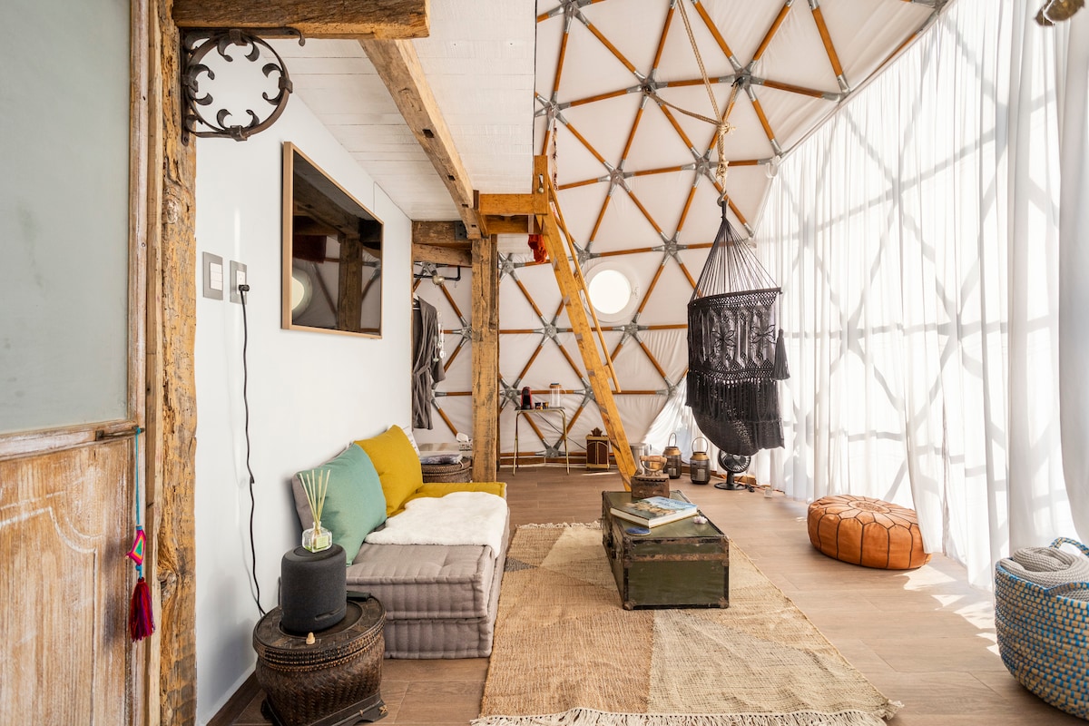 Una estancia excepcional y una experiencia poco probable en una ubicación espléndida. La terraza glamping en la azotea de Colonia Roma integra vistas panorámicas del paisaje urbano con su cordillera y atardeceres impresionantes mientras disfrutas de tu jacuzzi privado. En el centro de la Ciudad de México, la cúpula geodésica cuenta con una arquitectura única, amplitud y ambiente: una cocina totalmente equipada, un espacio de trabajo dedicado y entretenimiento de primera calidad, que se extiende a actividades de aventura y bienestar, ofrecen una escapada inigualable.