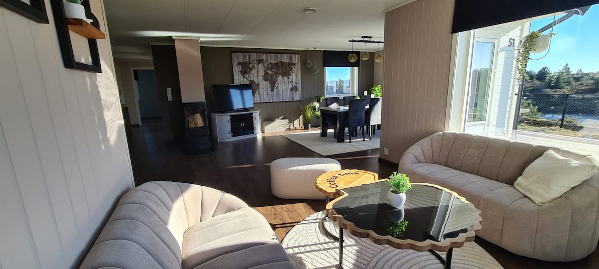 Lad batteriene på dette unike og rolige overnattingsstedet. Nyt sjø utsikten enten ved kjøkkenbordet, stuebordet, i utestue eller på en av hagens flotte uteområder. Tenn i peisen som er gjennomgående fra kjøkken til stue, eller ta deg et deilig bad i det gammeldagse badekaret med løveføtter. Huset ligger i et fredelig strøk, samtidig som det er sentralt. Kun 30 min. å kjøre til Bergen, og 10 min. kjøring til Knarvik senter. Gåavstand til nærmeste Kiwi butikk.