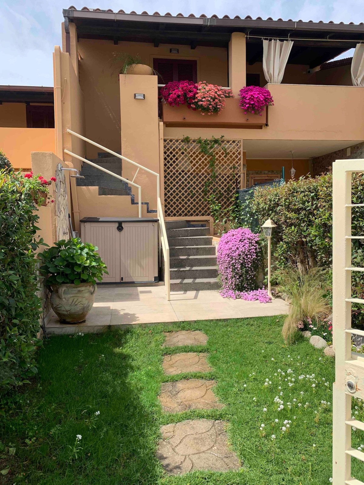 Villetta situata nel condominio di Is Traias, ad 1,5km dal centro citta, con accesso privato alla via e 2 parcheggi riservati. A meno di 5 minuti a piedi dalla spiaggia di Is Traias, raggiungibile attraverso un sentiero. La splendida vista su Punta Molentis e sull'isola di Serpentara la rende un posto unico in cui passare le vacanze. La casa è su due piani, ha un piccolo giardino sul retro con zona lavanderia e doccia e un giardino frontale a picco sul mare. Adatto a famiglie con bambini.