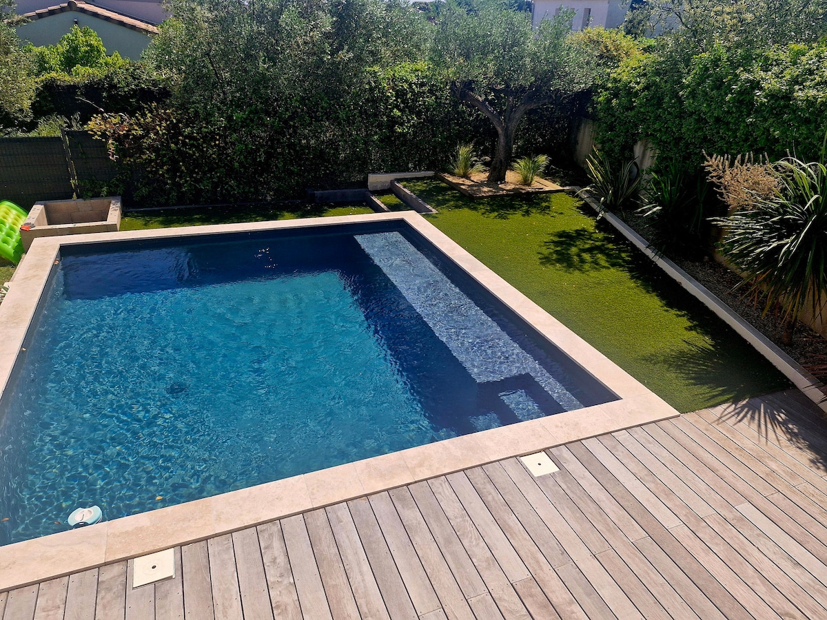 Casa de 42 m² con jardín privado de 100 m² y 2 terrazas con horno para PIZZA. Una piscina privada climatizada de 10 m² con vistas a la terraza está reservada para usted en el terreno (sin restricciones de horario para su uso), un jardín mediterráneo está presente con palmera, cocotero, limonero, platanero y olivo. La casa tiene una cocina americana completa ( nevera, placa de inducción, hornos, lavavajillas, cafetera tassimo...), una mesa y 4 sillas.