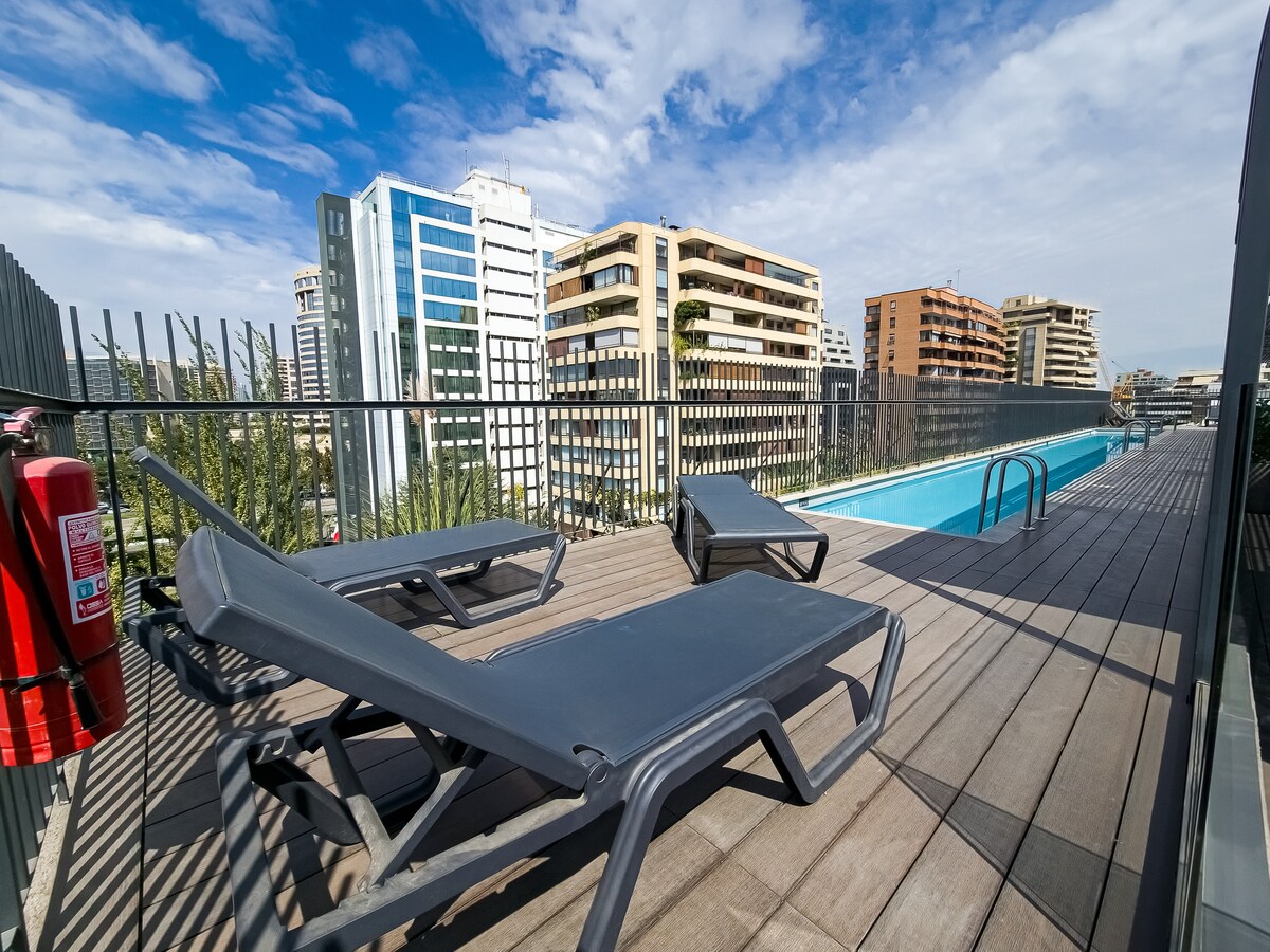 Beautiful and comfortable studio apartment steps away from Parque Arauco and Clínica Alemana. Enjoy a cozy and comfortable stay in Las Condes. Our Hosts are 1 click away! -Surrounded by cafes, restaurants and luxury shops -Comfortable King bed and 2-seater sofa bed -Kitchen fully equiped -High speed internet -Outdoor and indoor heated pool -Gym -Security and controlled access Ideal for: Business or pleasure People looking for a safe and quiet location
