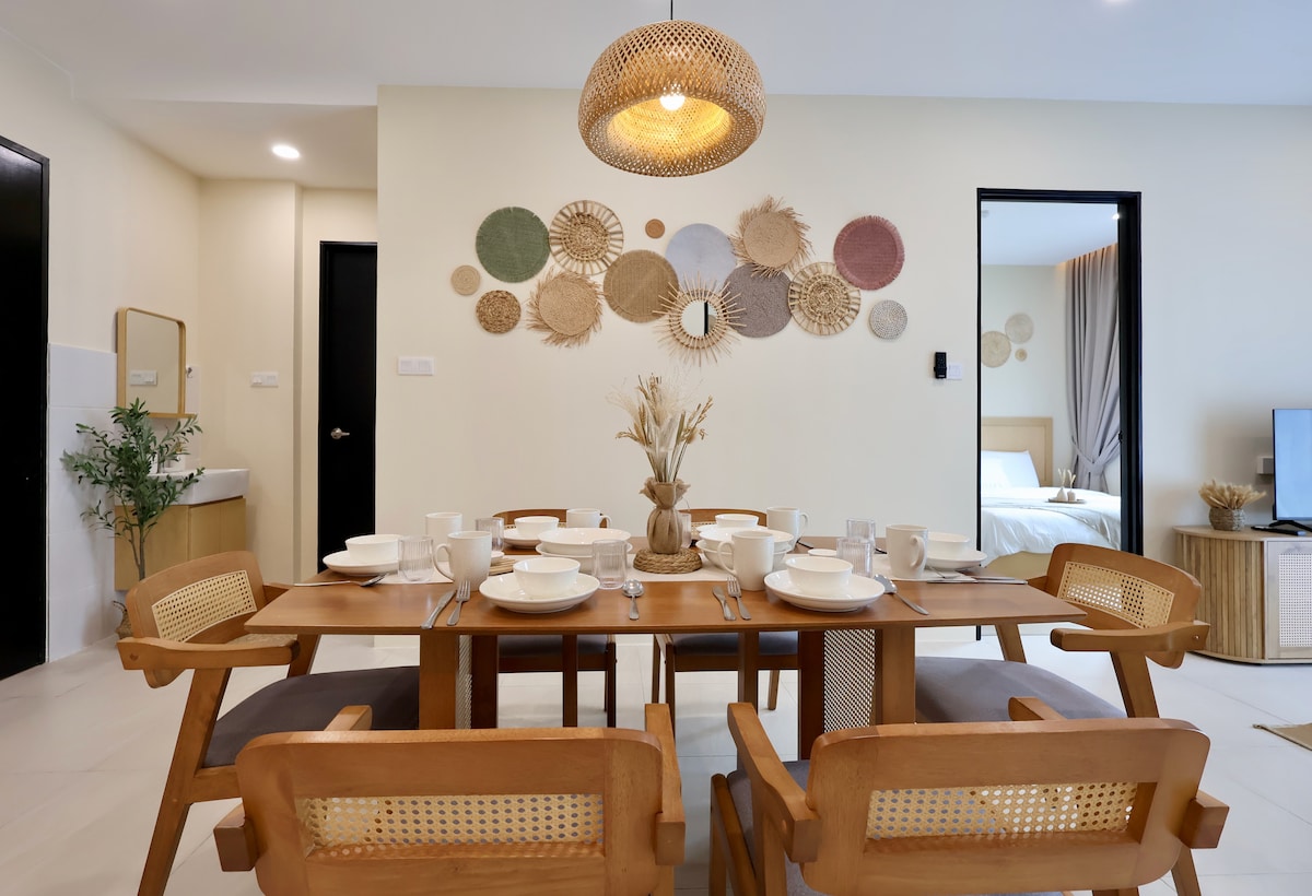 ¡Te damos la bienvenida a Dandelions @ Riverine Diamond Condominium! Dandelions es una unidad recién amueblada que se encuentra en el centro de Kuching. Incorporamos las exuberantes vibraciones verdes de Borneo en el diseño de esta unidad, deseando brindarte una vibración refrescante y rejuvenecedora de Borneo mientras disfrutas de la espaciosa unidad equipada con muebles finos. Nuestro balcón privado cuenta con una vista increíble del río Sarawak, el monte Santubong y la piscina infinita, equipada con una brisa fresca durante todo el día también.