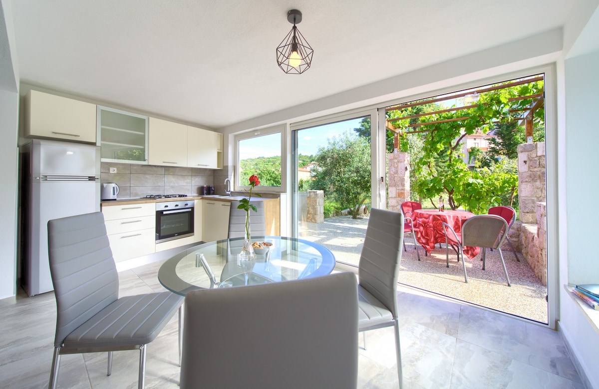 Relájese y disfrute de un apartamento tipo estudio moderno. El apartamento está situado en una zona tranquila de Vrbnik y está a pocos minutos del centro de la ciudad (tiendas, panaderías, restaurantes...) y a pocos minutos de la playa. El espacio con aire acondicionado consta de una sala de estar y una cocina totalmente equipada con horno y lavavajillas. En el segundo piso hay una habitación y un baño. También hay un espacio exterior con muebles de jardín.