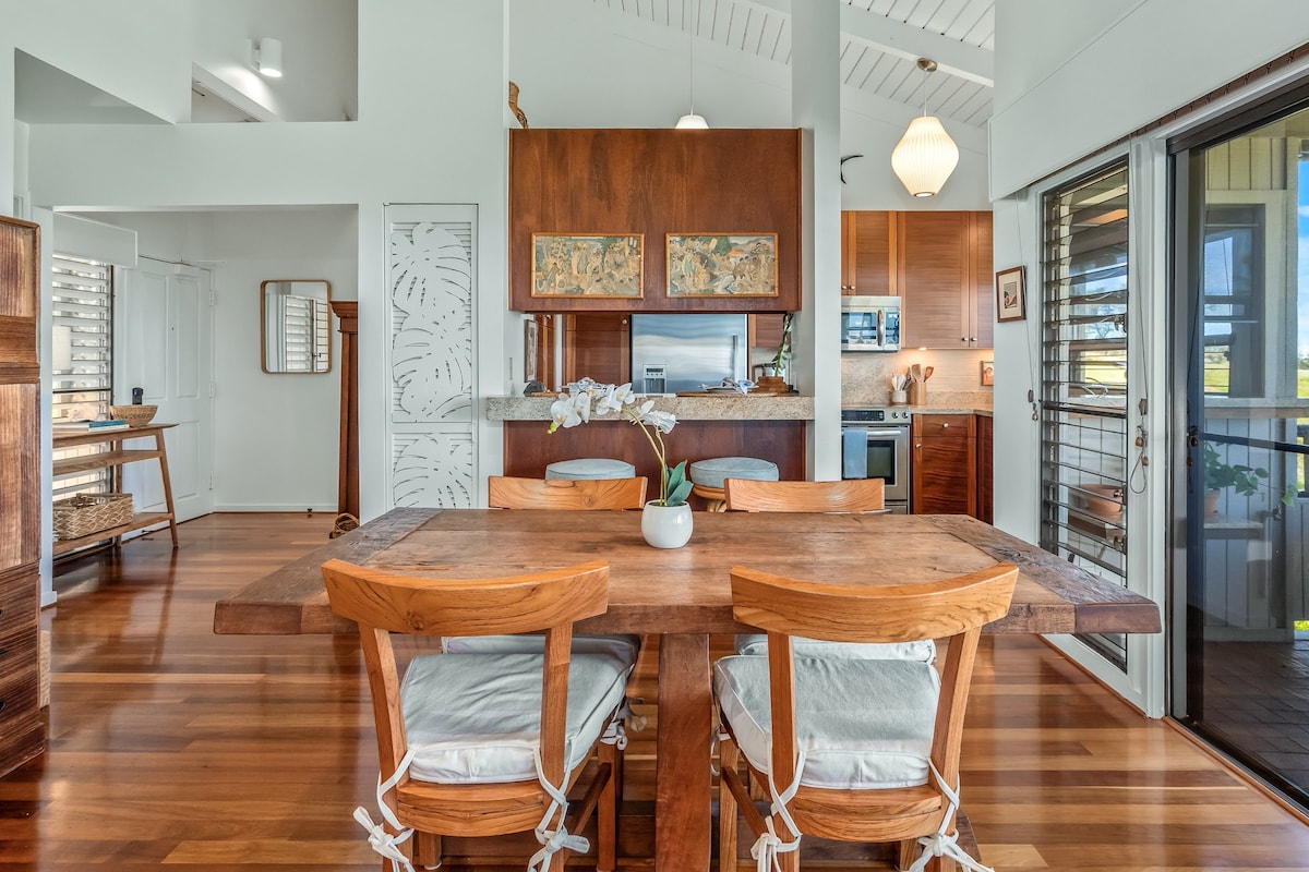 Vive como un habitante más en Ocean Blue Ohana, el primer piso privado de esta increíble casa hawaiana de postes en una propiedad de media hectárea en el sur de Maui. Al entrar en el espacio, te sentirás atraído por las amplias vistas panorámicas al mar. Estás en lo alto, encaramado a 500 pies sobre el nivel del mar, contemplando las vistas más gloriosas de las islas vecinas, las montañas, la costa y el increíble horizonte de Maui. Para colmo, estás a 5 minutos de los centros vacacionales de Wailea y de hermosas playas de arena dorada y aguas cristalinas.