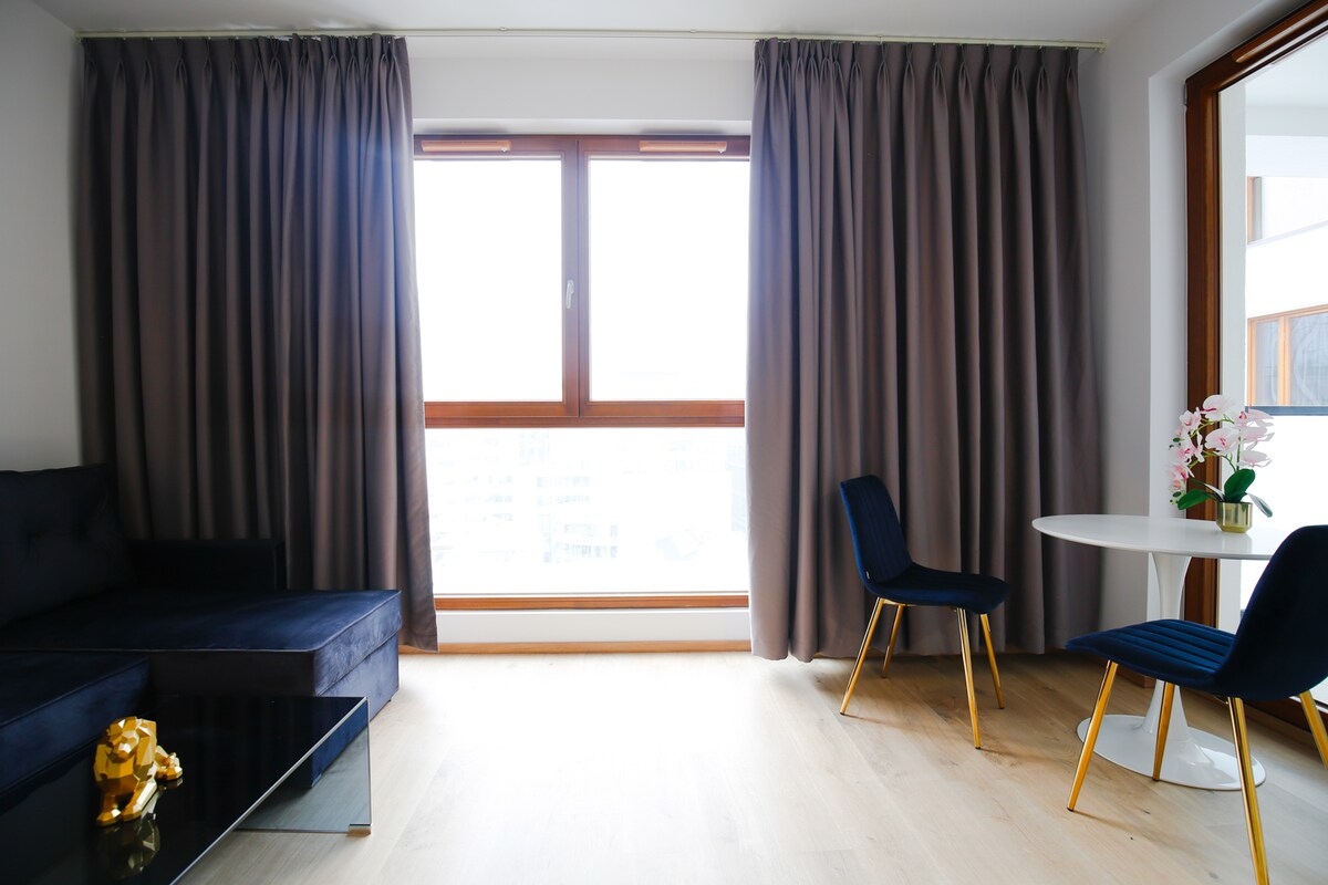 Un moderno apartamento de 40 m2 con aire acondicionado y ventanas con vistas a los edificios de oficinas comerciales cercanos en el centro de Varsovia, creando una impresionante iluminación nocturna. Es un lugar único donde las bulliciosas calles con restaurantes y pubs de moda entran en contacto con lugares atmosféricos llenos de historia: los restos de fábricas de antes de la guerra o casas de viviendas judías del gueto.