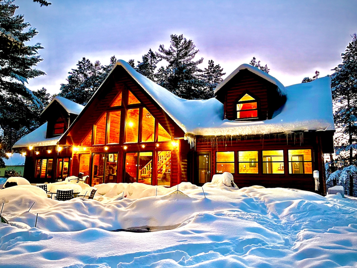 Escapada de cuatro dormitorios centrada en 12 acres para disfrutar de la máxima privacidad y vida silvestre. Esto es para alguien que quiere la vida del lago, pero también privacidad. Mira por las 30 ventanas y disfruta de las vistas del lago/muelle, el arroyo navegable que desemboca en otros dos lagos, los abundantes robles/álamos o a la familia disfrutando de una fogata y smores. Tu cabaña viene equipada con una canoa, kayak, tabla de remo, chapoteadero, juegos al aire libre, juegos de interior, mesa de póquer/billar, 5 televisores inteligentes y mucho más. Sal a los senderos para todoterreno/motos de nieve.