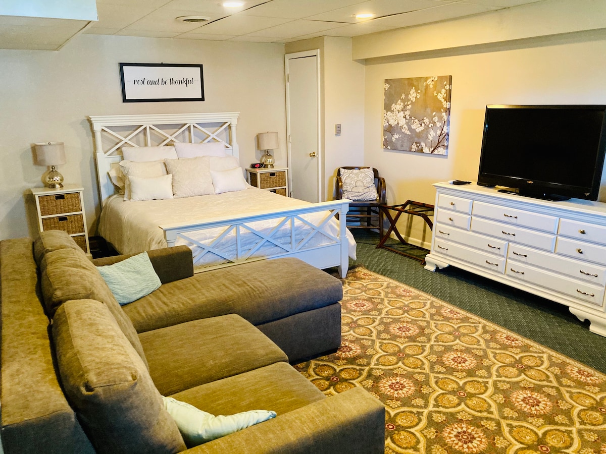 Amplia suite privada con entrada independiente y baño completamente nuevo. Tendrás todo el nivel inferior con un baño completo que incluye lavandería. Hermoso dormitorio tamaño queen. Cómodo sofá con diván listo para que pongas los pies en alto y te relajes. Tiene una cama tamaño queen extraíble para dormir más. Mesa de juegos con suministros. Barra de café con todos los elementos esenciales, incluida una mininevera y microondas. Incluso puedes hacer ejercicio usando la cinta de correr.