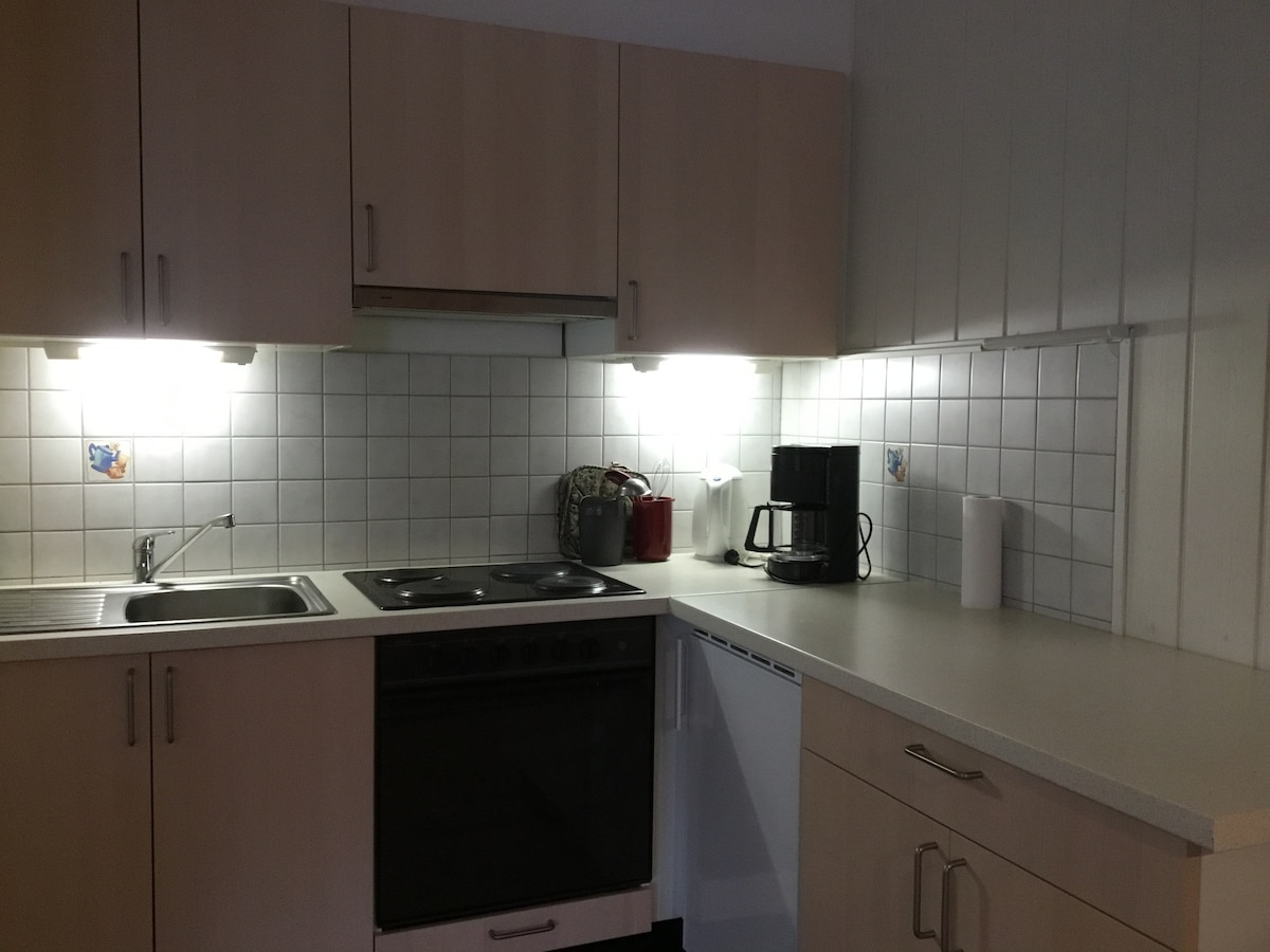 Este alojamiento está situado en la planta baja de una casa unifamiliar, tiene una entrada independiente con cerradura de combinación, una cocina totalmente equipada que incluye nevera, tostadora, cafetera, vitrocerámica y hervidor de agua. Un cuarto de baño con bañera y ducha, un aseo separado con lavadora y secadora forman parte del equipamiento. En el dormitorio con 2 camas, una de las cuales se puede convertir en una cama doble, hay un televisor. Además, el apartamento tiene un gimnasio y sala de recreo.