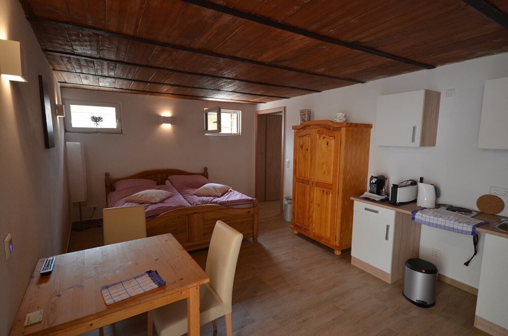 Siéntase como en casa en nuestra nueva casa en las afueras de Weisweil am Rhein, a solo 8 minutos en coche del Europa Park, al borde del Kaiserstuhl y Taubergiessen. A 15 km de la autopista, parada de autobús a solo 300 m. A unos 60 minutos en coche de Feldberg. 40 m², salón-comedor y dormitorio abiertos, cocina, nevera con congelador, tostadora, hervidor de agua, vitrocerámica, horno, secador de pelo, sofá cama, 2 camas dobles, LAN, WLAN, TV vía satélite, Netflix, lavadora, secadora, aparcamiento y balcón cubierto.