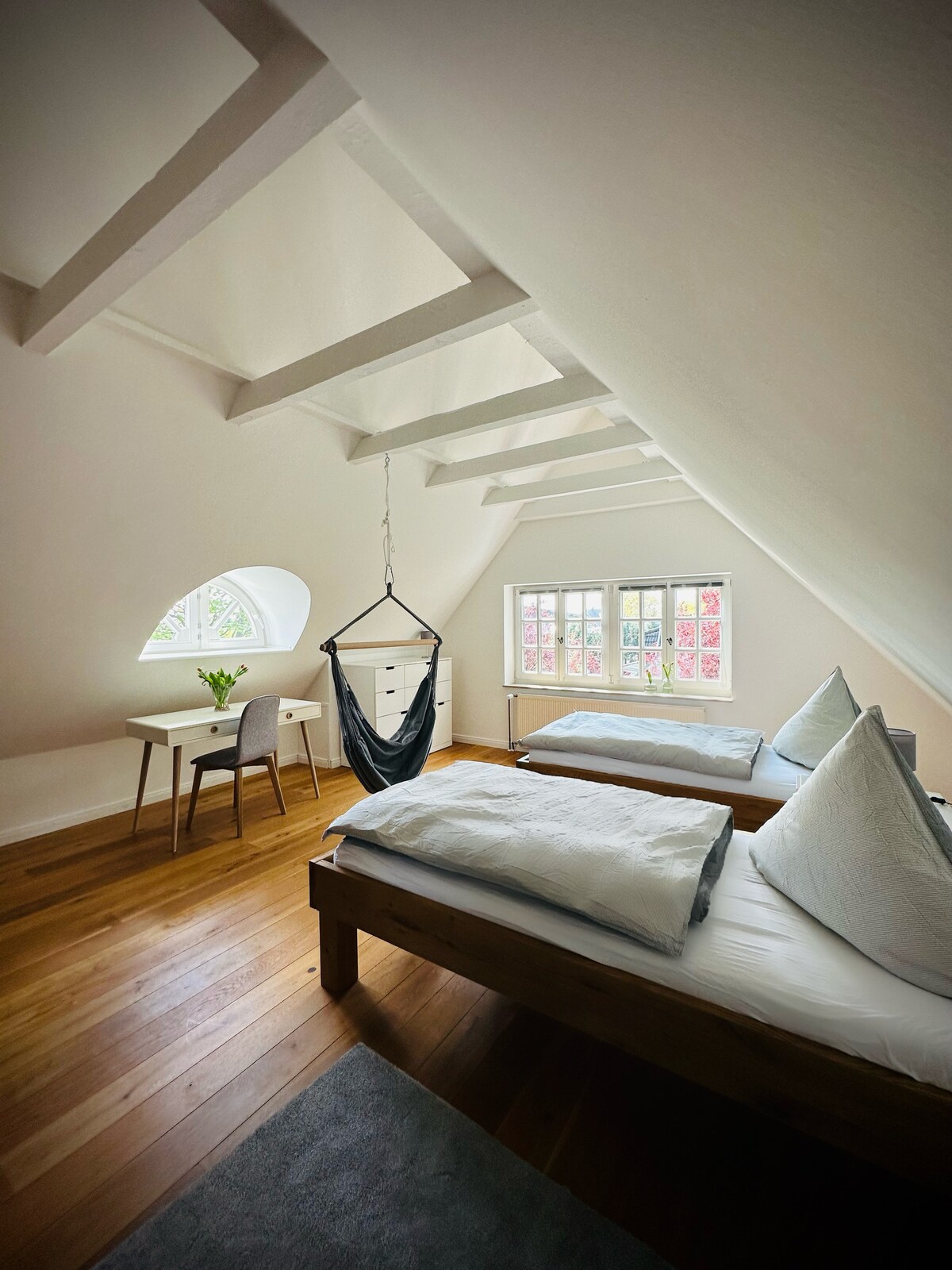 Bienvenidos a nuestro encantador apartamento tipo estudio con dormitorios adicionales. Se encuentra en el ático de un hermoso edificio de 1900 y tiene su propia entrada, a través de la cual se puede entrar y salir sin molestias cuando se desee. El apartamento tiene una cocina espaciosa y una gran sala de estar con TV incl. acceso a Netflix. También quien tenga algo que hacer encontrará un escritorio con LAN / WLAN. Además, tienes tu propia pequeña zona de jardín con mesa y sillas.
