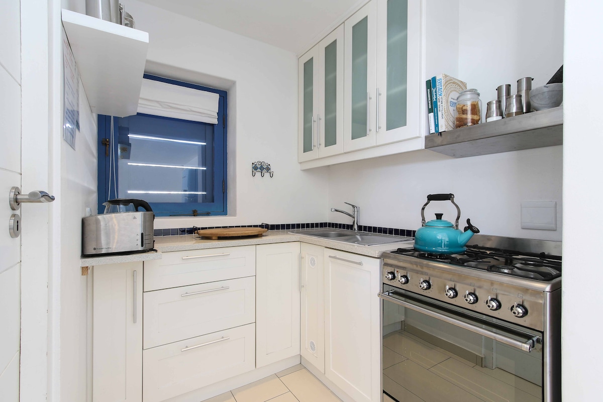 Our apartments are sanitized between every guest departure and arrival by me personally. With its white washed walls, blue finishes and seconds from the endless stretches of white sandy beaches with azure waters, mysterious sunrises, and vivid sunsets . This apartment sleeps a couple Beautiful upstairs Bachelor's unit with Limited Sea Views , queen bed, kitchenette, en-suite bathroom with shower and SHARED patio with outside braai/barbecue. Situated approximately 80m from the beach.