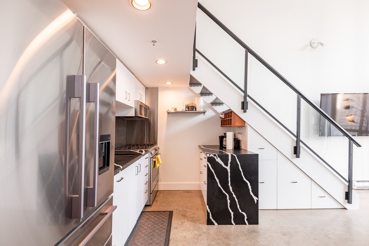 Loft de 2 niveles en el corazón del centro de Vancouver. Justo al lado de la Franja de Granville y a 2 manzanas de las tiendas de Robson y el Skytrain. Nestors Market justo enfrente. Cocina completa con todo lo que necesitas, incluida una cafetera Bosch incorporada que hará cualquier café, latte o espresso que quieras. El patio privado más grande del edificio con mesa de fuego y barbacoa. Capacidad para 4 personas y hay lavandería en la suite. 1 aparcamiento para vehículos y 1 aparcamiento para motocicletas.