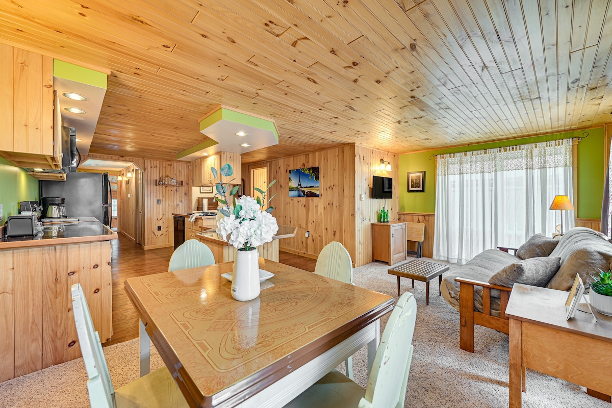 ¡Regálate un retiro relajante en este encantador loft en el bosque! Este apartamento recién reformado cuenta con 1 dormitorio queen, 1 baño completo, cocina completa y sala de estar con sofá cama. Acabado en precioso pino para esa sensación de cabaña acogedora. ¡Sendero para motos de nieve justo detrás de la cabaña! ¡A solo unos kilómetros de distancia del acceso a la ruta de todoterreno! Convenientemente ubicado cerca de la ciudad para todas tus necesidades. Aparcamiento privado/abundante, incluido el garaje.