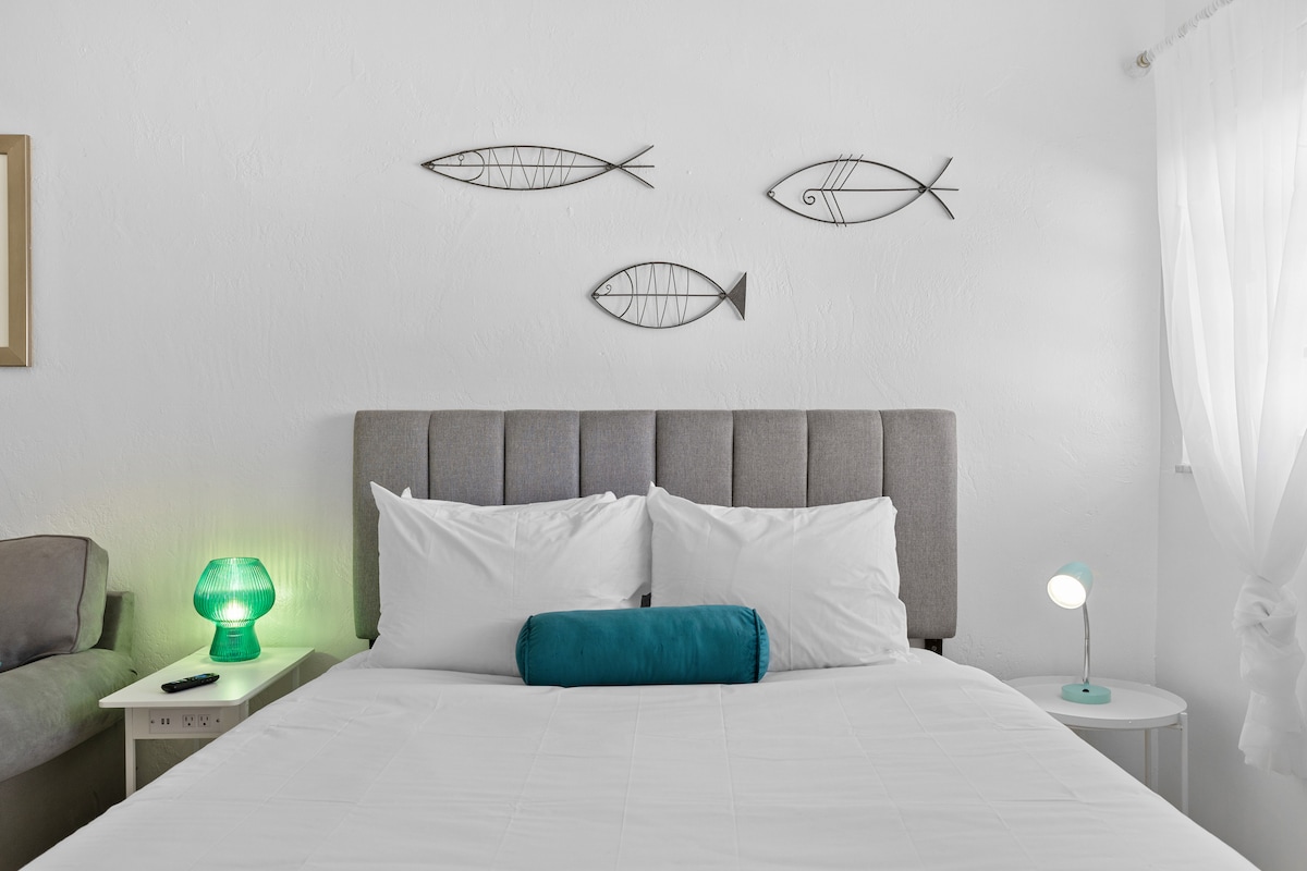Este es un refugio moderno de mediados de siglo recién reformado en el corazón de Pembroke Pines. Este cómodo estudio es ideal para estancias cortas, con una cocina completa, un baño bellamente actualizado y una amplia sala de estar. Relájate en una cómoda cama tamaño queen y un futón que se abre a una cama doble. Incluye café de cortesía, artículos de aseo, wifi rápido y un televisor inteligente con aplicaciones de streaming. Sumérgete en la comodidad y el estilo en este acogedor espacio en la vibrante Pembroke Pines.