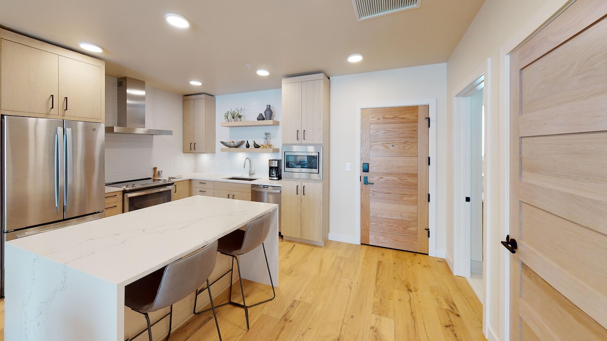 Este apartamento de 2 dormitorios y 2 baños cuenta con vistas de 180 grados de las montañas Bridger. La ventana extragrande que da al norte la habitación tiene luz natural. Tiene una cocina completa, sala de estar, 1 cama king, 1 litera, 2 baños completos, vestidor y lavandería. Espacio de entretenimiento en la azotea al aire libre para que las usen los huéspedes. El condominio está arriba del club social Ponderosa, el salón Ceremony y el spa y la barbacoa Bourbon. Distancia a pie de muchos favoritos locales, como Freefall Brewery, The Elm y Access Fitness.