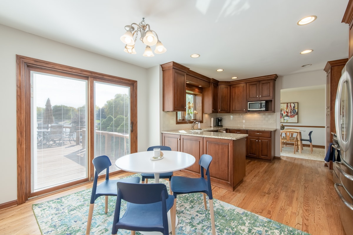 ¡Bienvenido al Naperville Nest! ¡Rara oportunidad de North Naperville para encontrar una casa adecuada para toda la familia! Mascotas son más que bienvenidos a disfrutar de la 1/2 acre totalmente vallado en el patio. Esta es una casa totalmente actualizada a minutos del centro de Naperville, I-88 y muchos otros destinos emocionantes en los suburbios occidentales. Te sentirás como en casa si estás dentro o fuera...cada habitación tiene su propia televisión y la vida al aire libre incluye chimenea de gas natural y parrilla/mesa de comedor... ¡esta casa lo tiene todo!