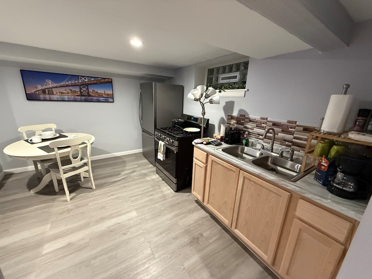 Excelente ubicación. Recientemente mejorado. Espacio: Esta es una nueva suite de invitados en el sótano de mi casa. La suite está equipada con una cocina completa con electrodomésticos de alta calidad. La suite incluye un baño grande, un dormitorio con un colchón tamaño queen nuevo y una lavadora y secadora en el lugar. La suite ofrece un lugar tranquilo y cómodo para hospedarse. A 2 manzanas a pie llegarás al tren de cercanías, sándwiches Subway, una tienda de delicatessen italiana, farmacia CVS y Starbucks.